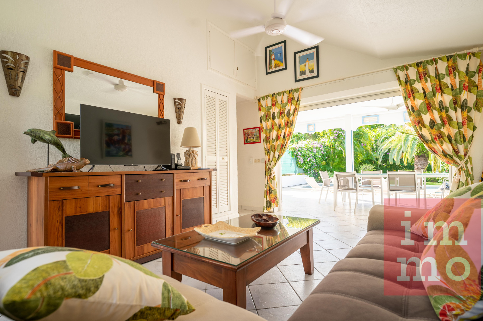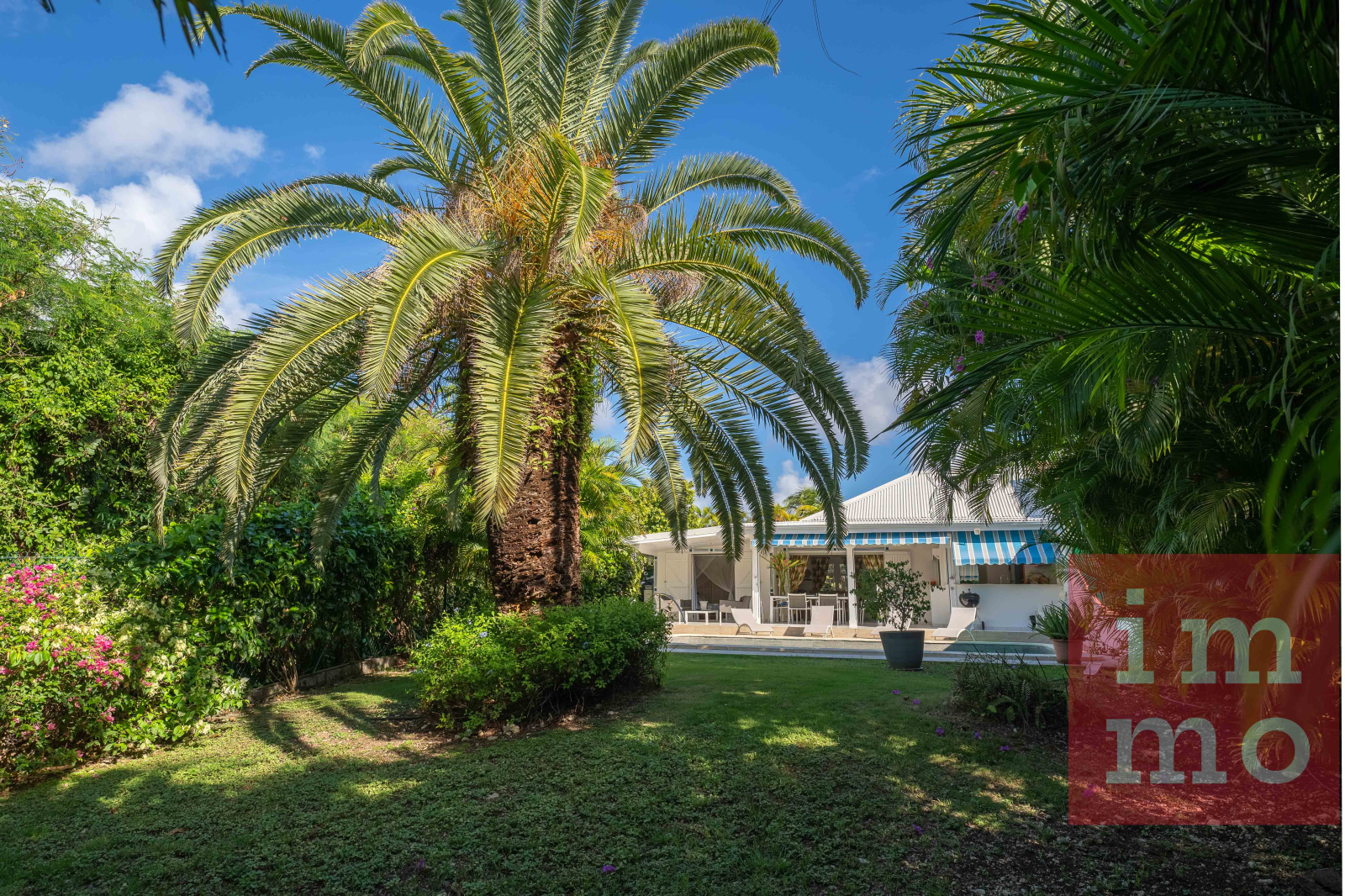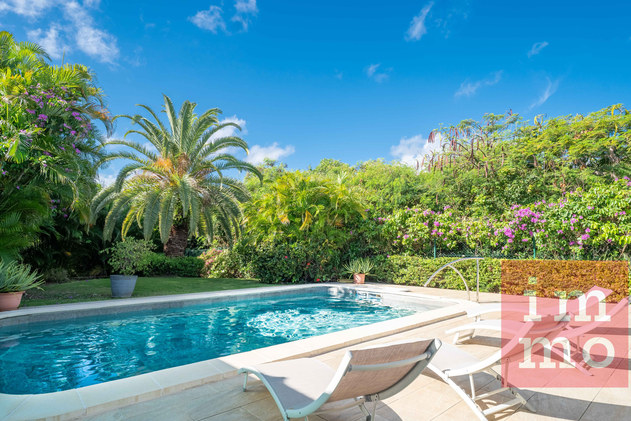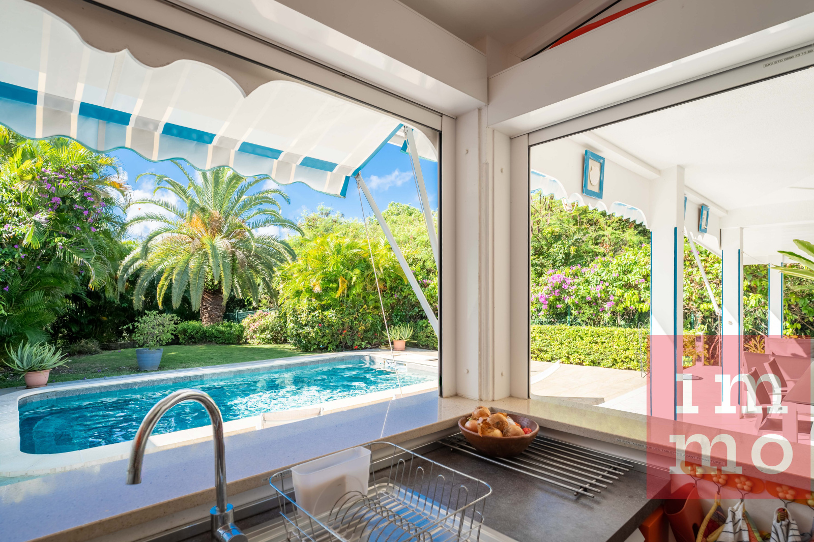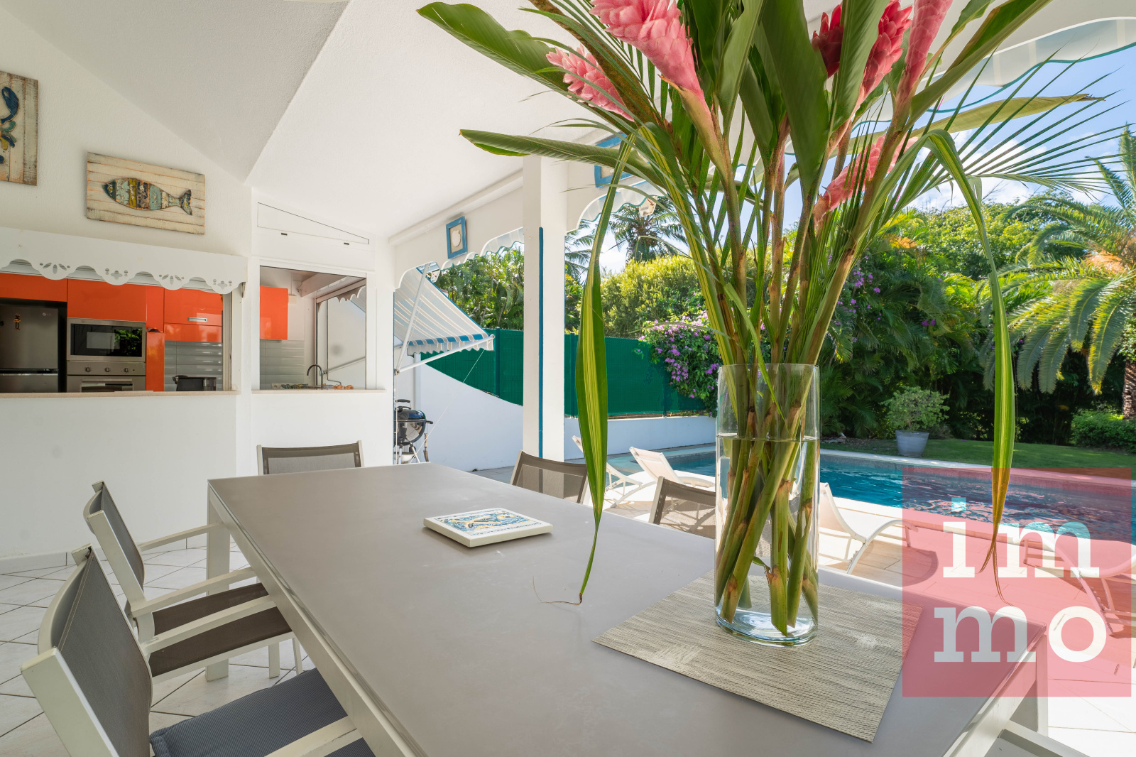 Le séjour lumineux s’ouvre sur une terrasse couverte et une piscine sans vis-à-vis. La cuisine ouverte, regarde un joli jardin tropical où trône un palmier Phoenix, majestueux et solitaire.