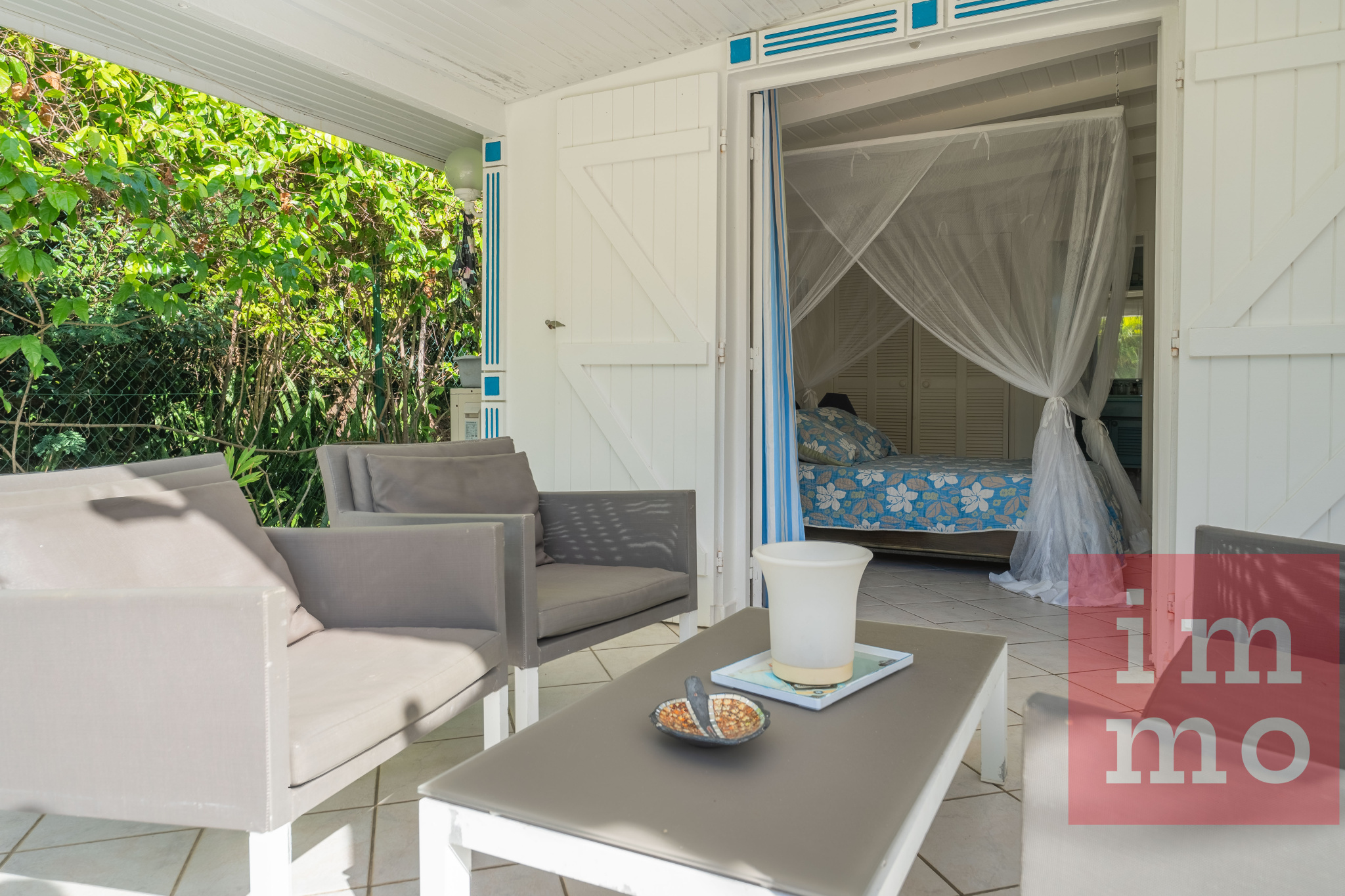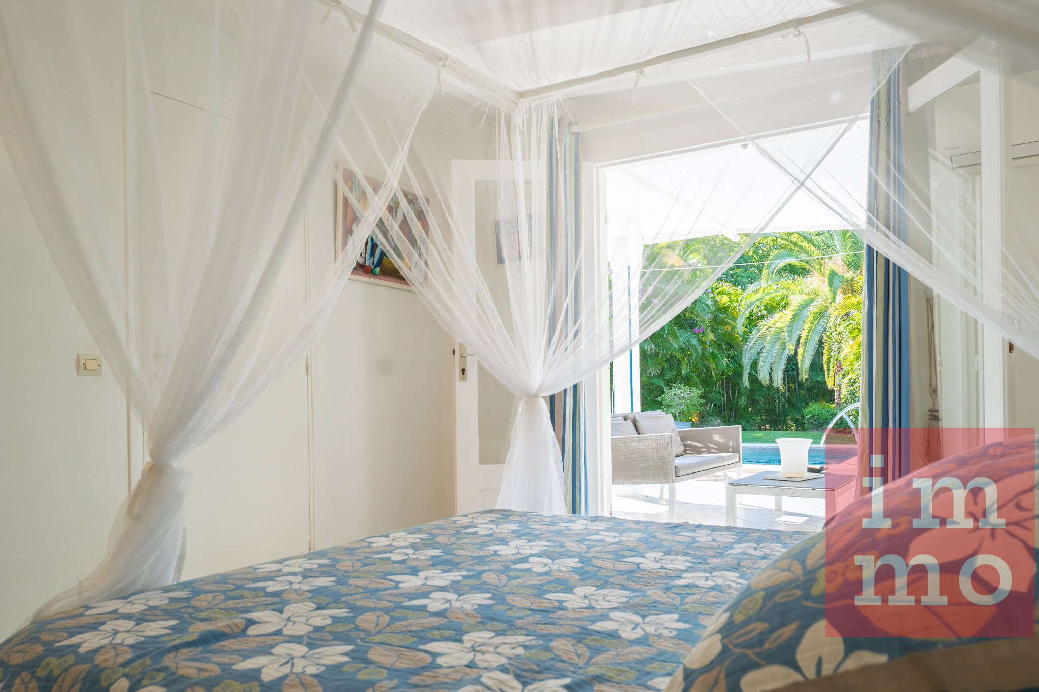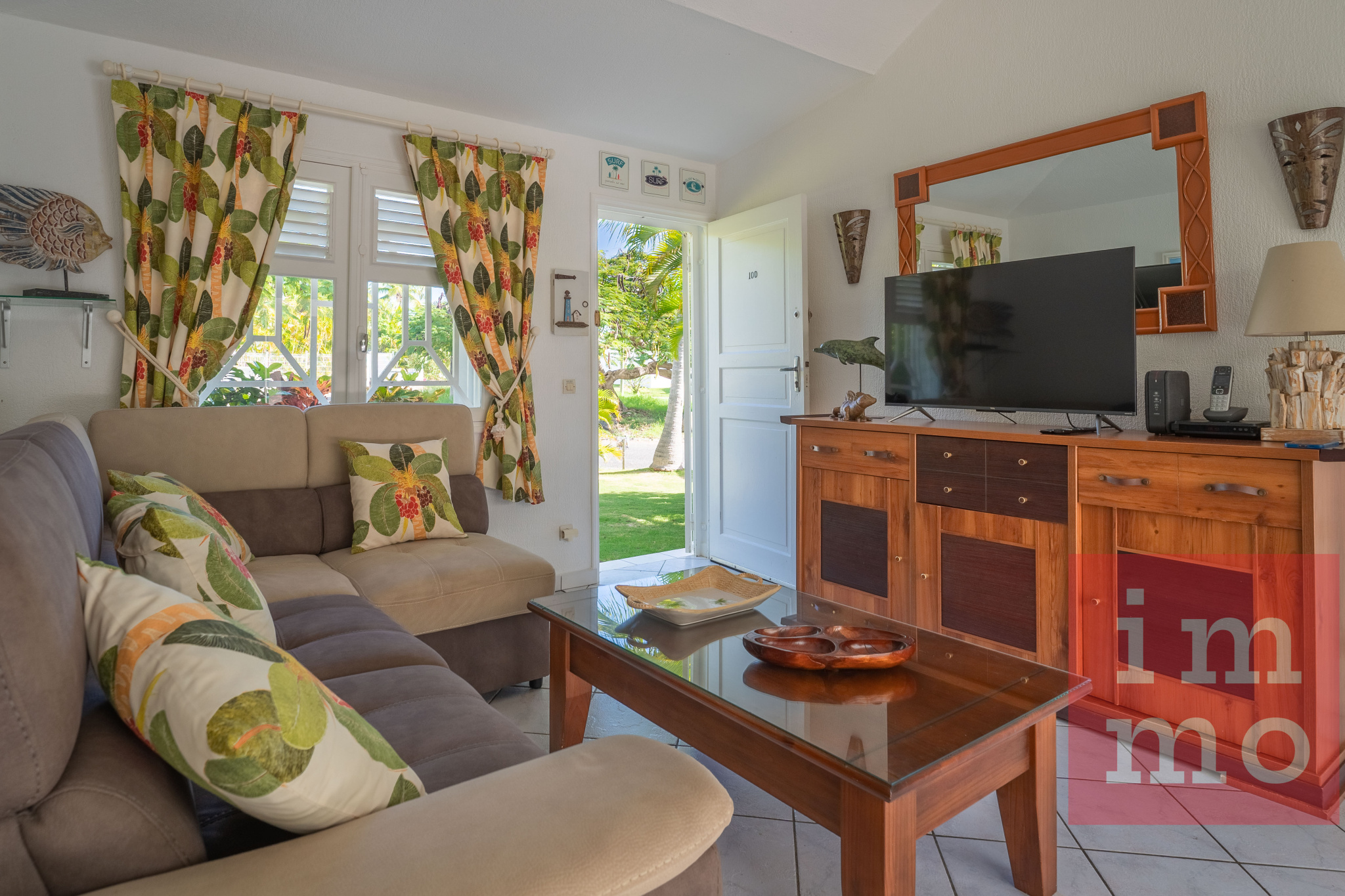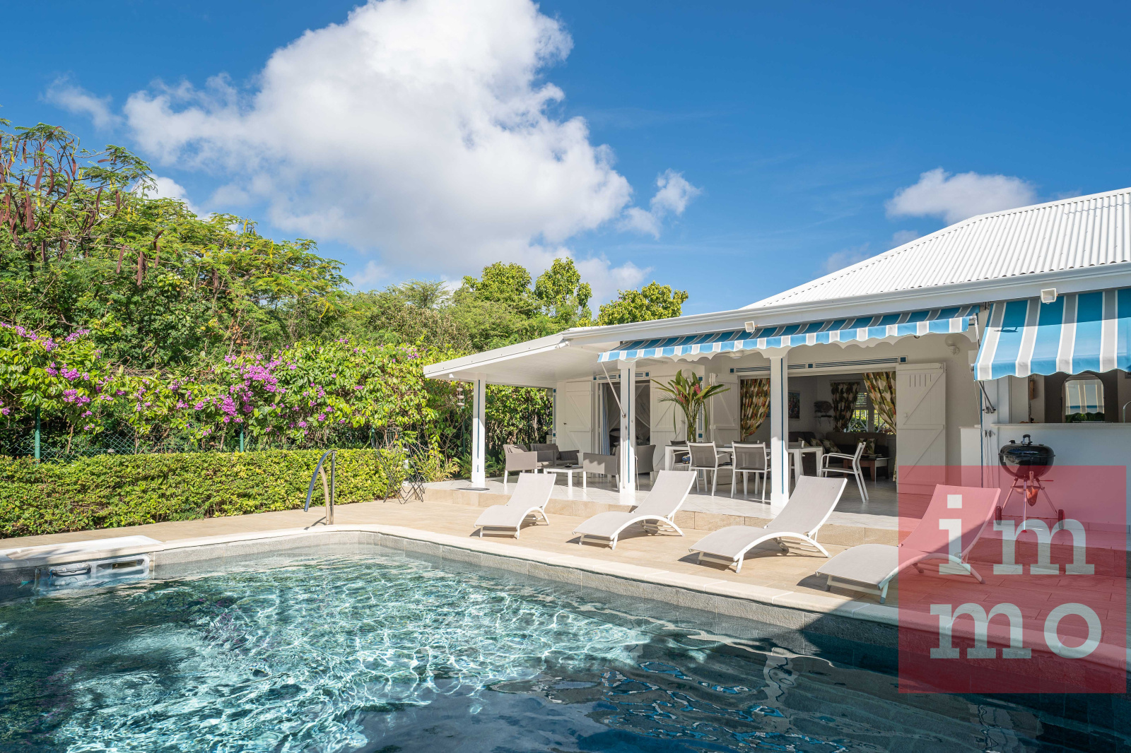 Le séjour lumineux s’ouvre sur une terrasse couverte et une piscine sans vis-à-vis. La cuisine ouverte, regarde un joli jardin tropical où trône un palmier Phoenix, majestueux et solitaire.