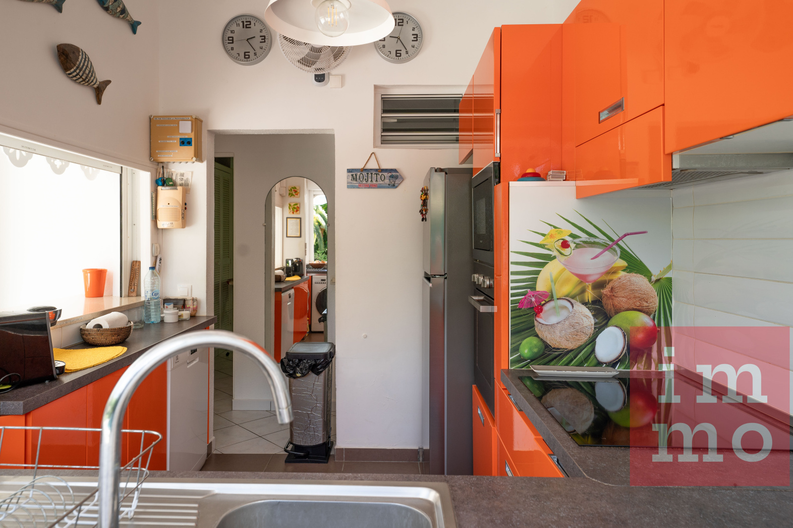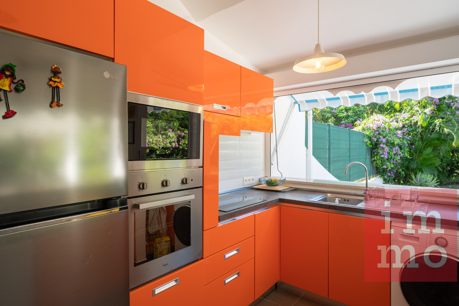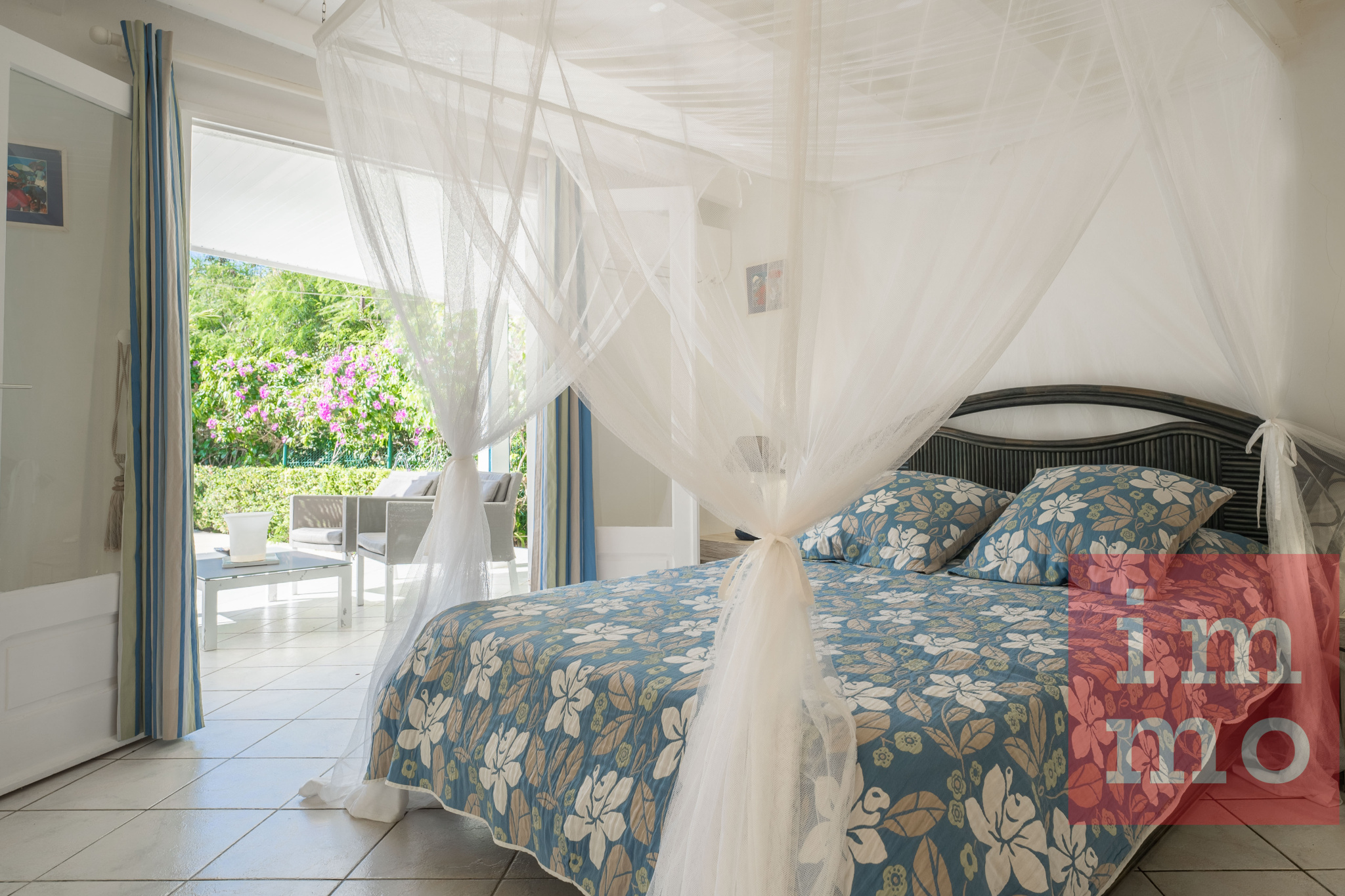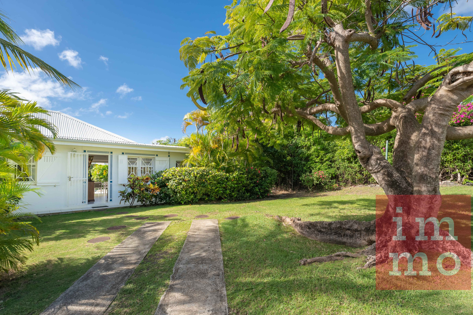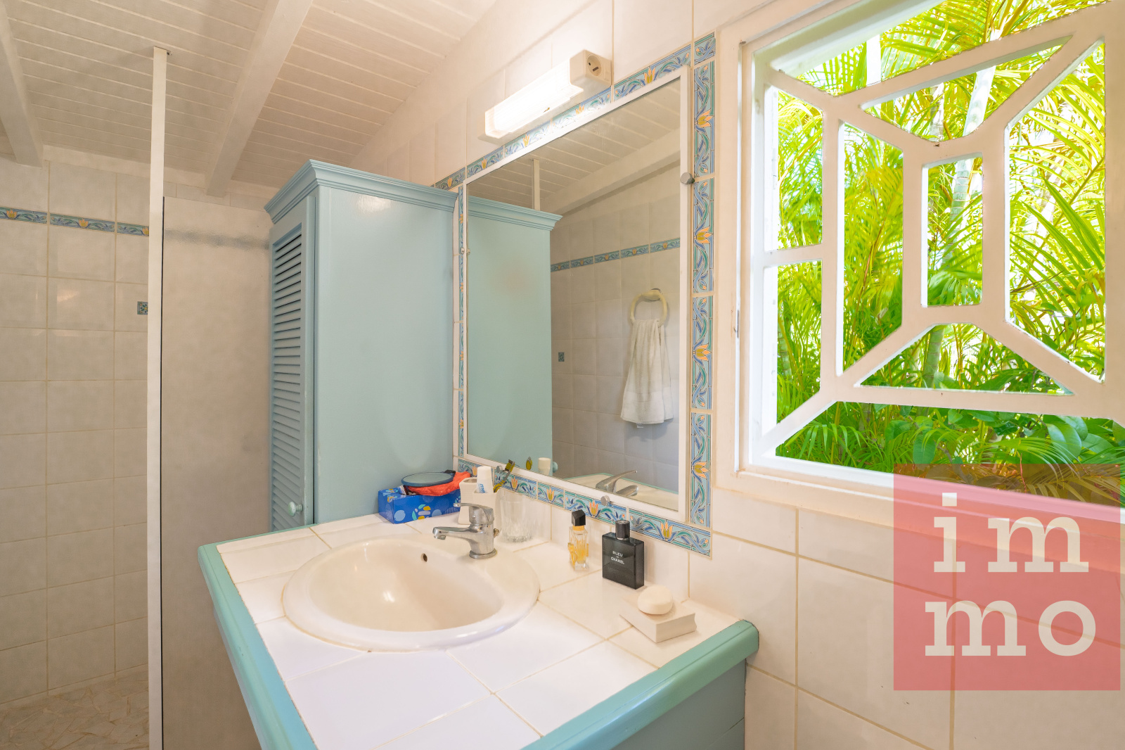 Le séjour lumineux s’ouvre sur une terrasse couverte et une piscine sans vis-à-vis. La cuisine ouverte, regarde un joli jardin tropical où trône un palmier Phoenix, majestueux et solitaire.