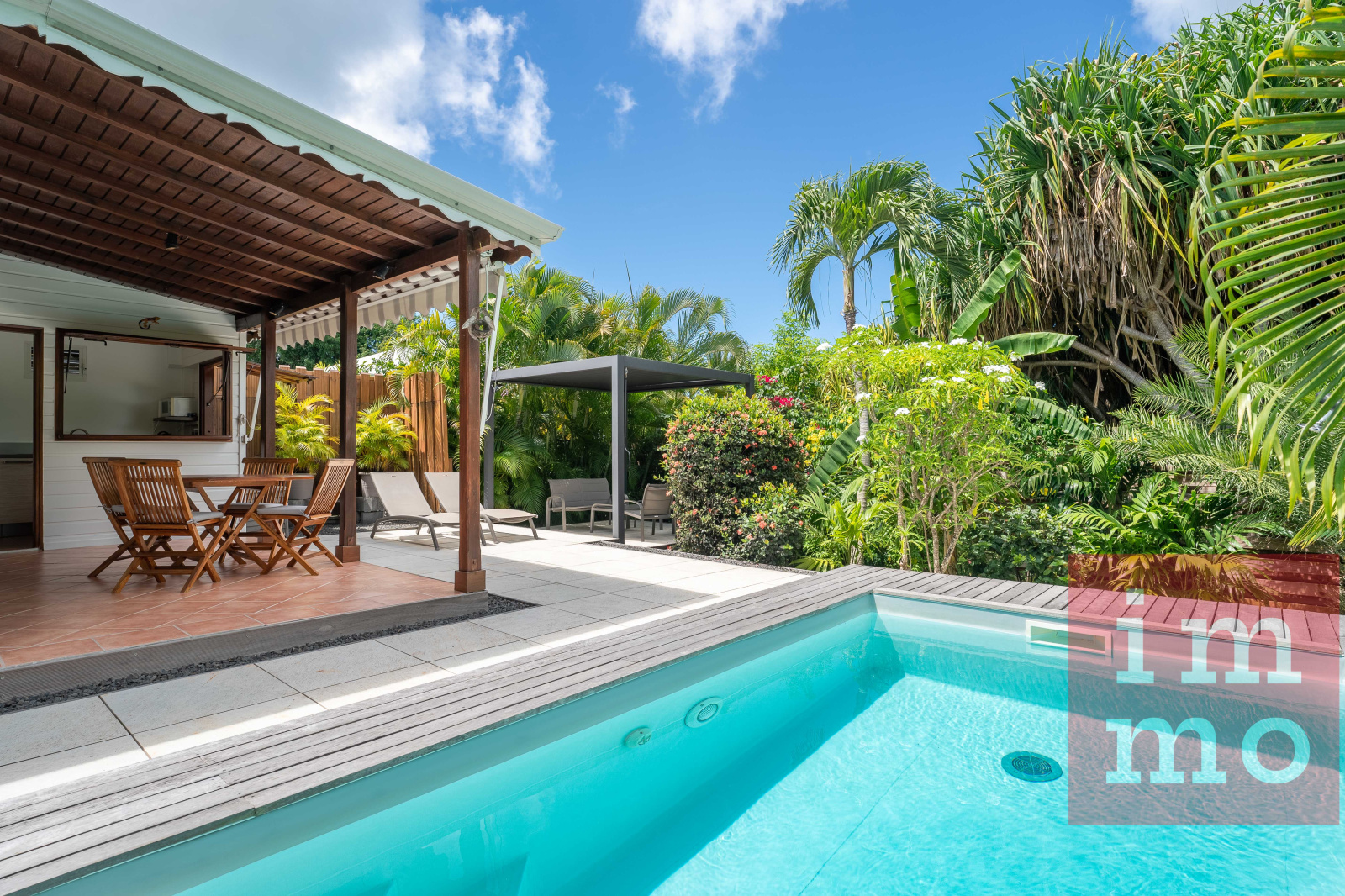 Il est composé d’une cuisine aménagée et équipée, d’un cellier/buanderie, d’une chambre avec séjour, d’une salle d’eau avec wc, et d'une terrasse couverte. Le plus une pergola bioclimatique idéale pour profiter des journées ensoleillées.