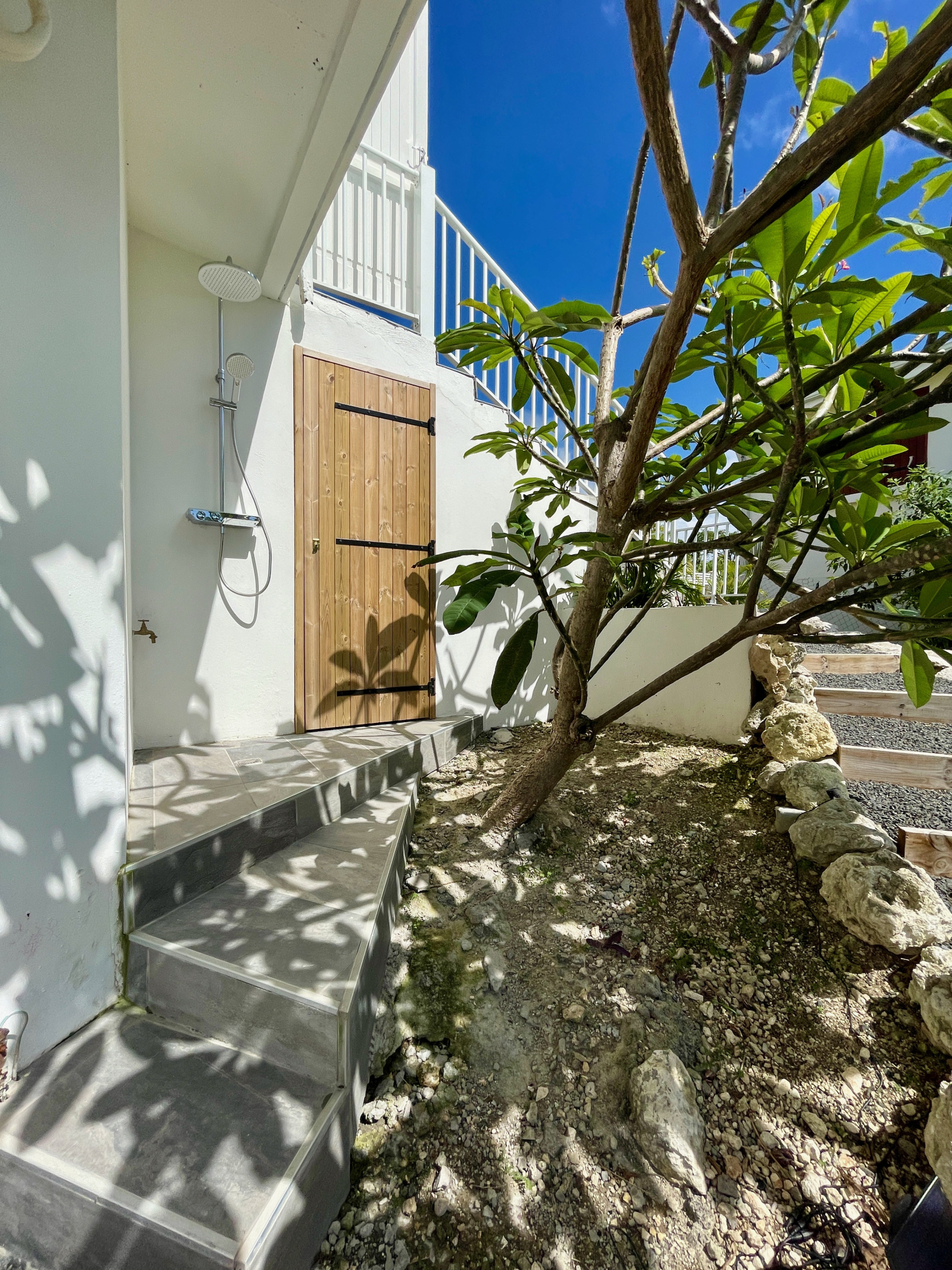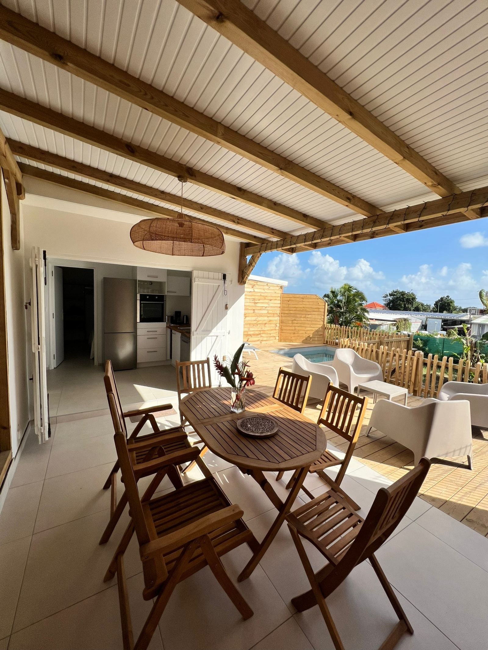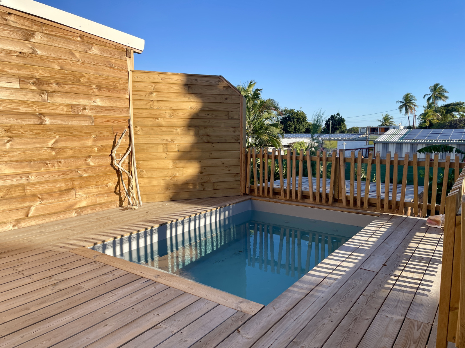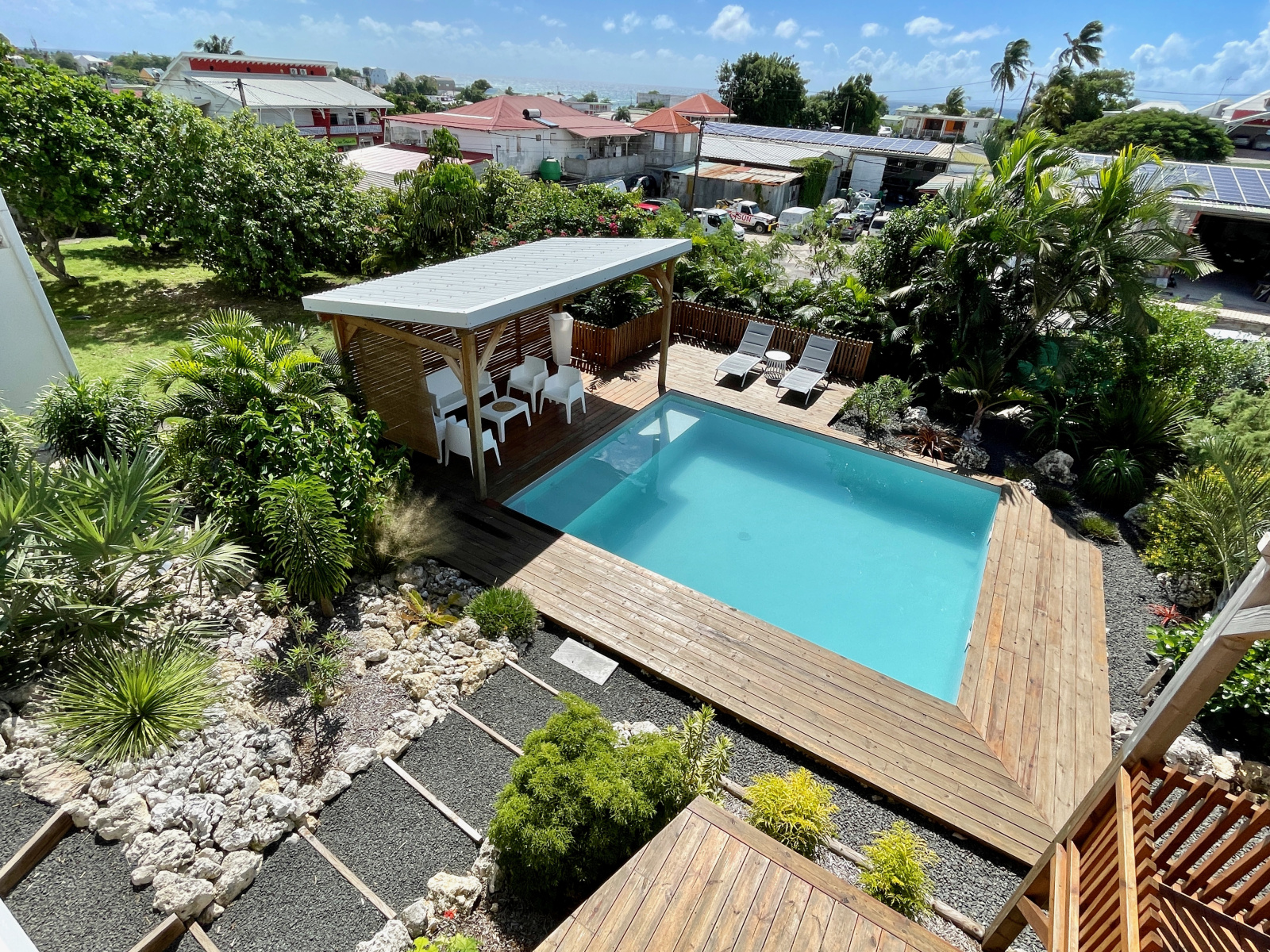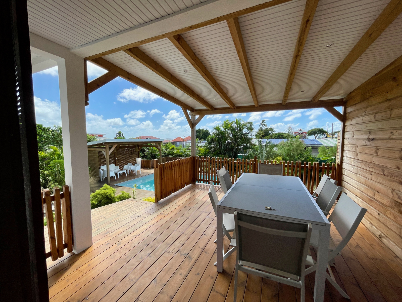 Au bord de sa piscine entourée d'un deck vous vous relaxerez sous un carbet et une belle terrasse couverte. Douche extérieure avec WC.