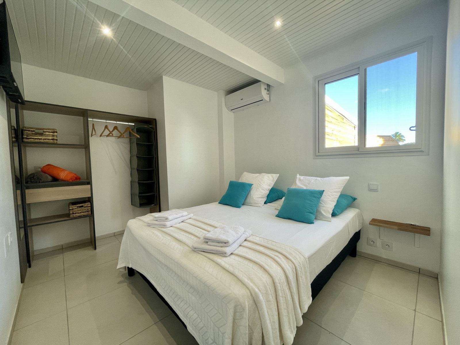 Le T3 : Terrasse couverte prolongée d'un grand deck, orientée vers le jardin et sa piscine privative. Belle cuisine équipée. 2 chambres climatisées se partagent une salle d'eau. WC indépendant.