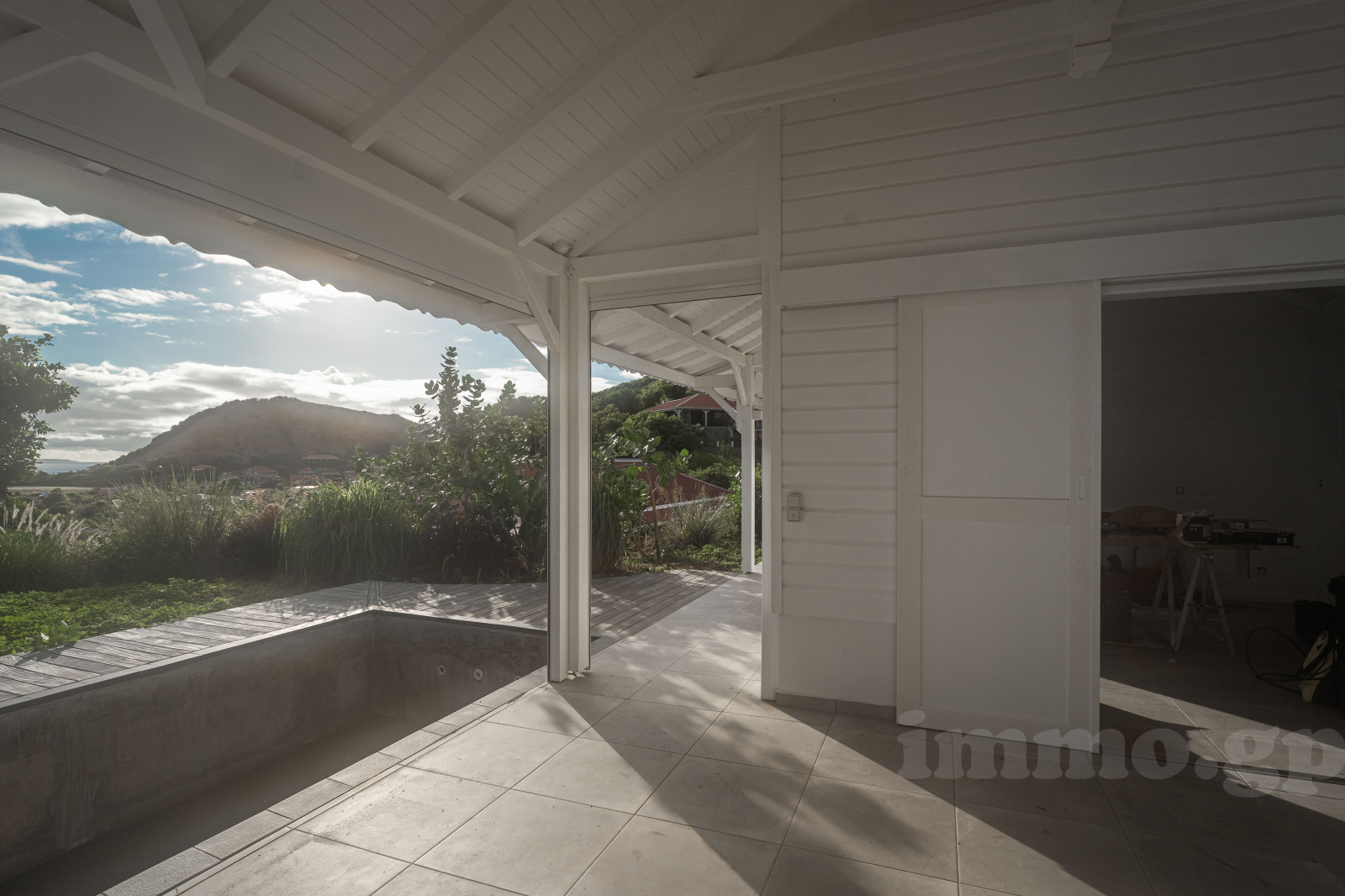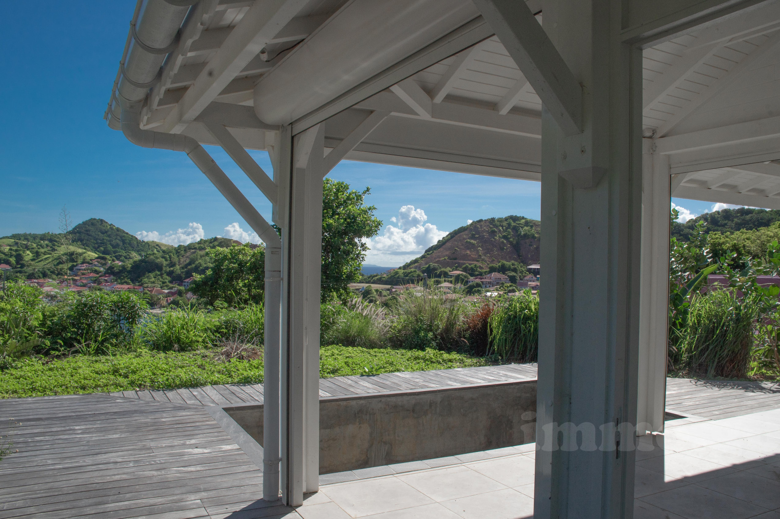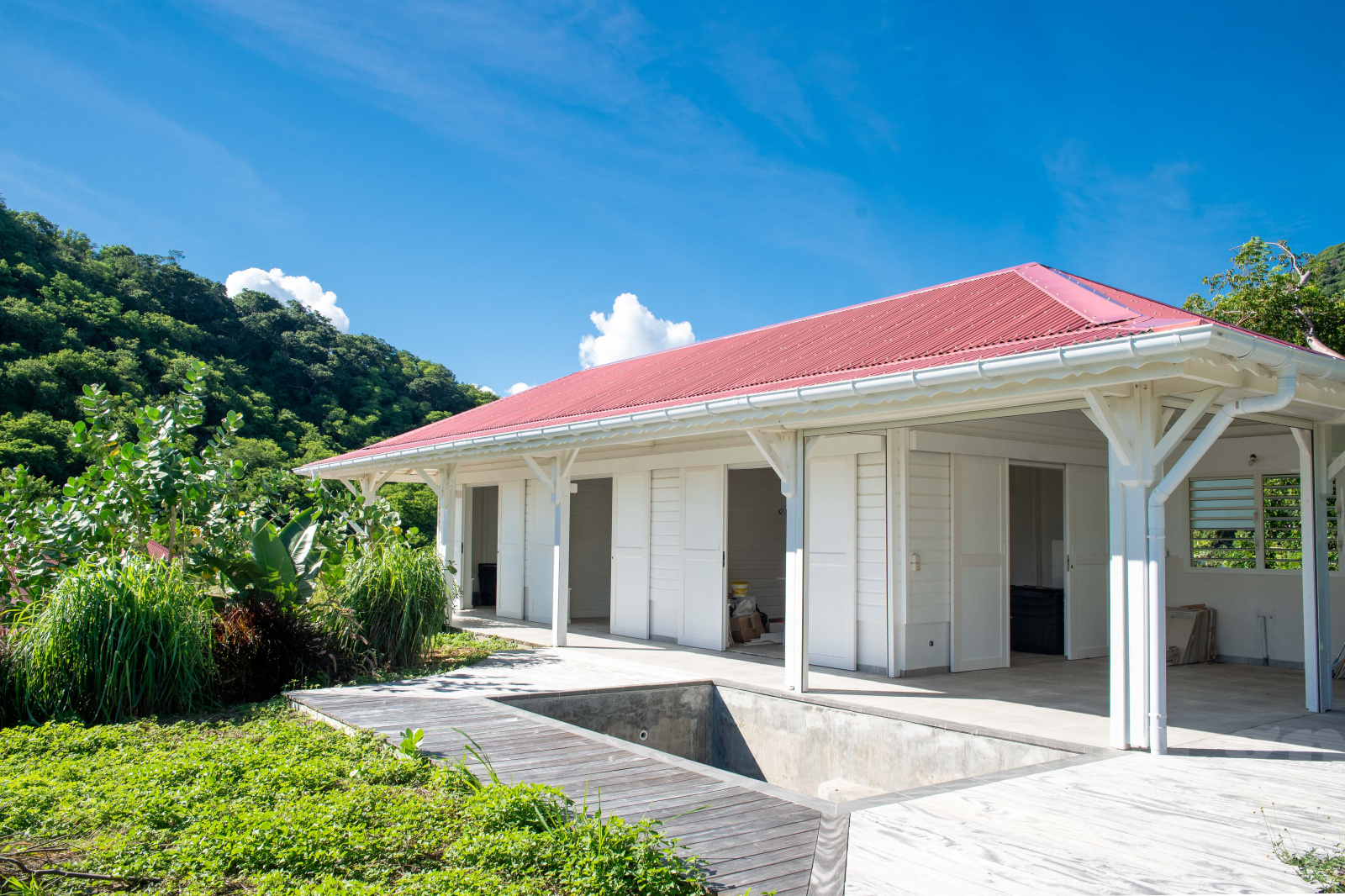 Villa de plain-pied édifiée en béton et bois exotique avec une charpente traditionnelle et toiture en aluminium. Toutes les pièces voient la mer. La villa est constituée d'un salon cuisine ouvrant sur un deck et piscine. Les trois chambres de 14 à 18 m2 bénéficient de larges ouvertures sur la terrasse et la cousrsive et se paratgent 2 salles d'eau et wc. Les salles d'eau sont équipées de vasques italiennes, les revêtements muraux sont réalisés en pâte de verre. Toutes les pièces sont climatisées.