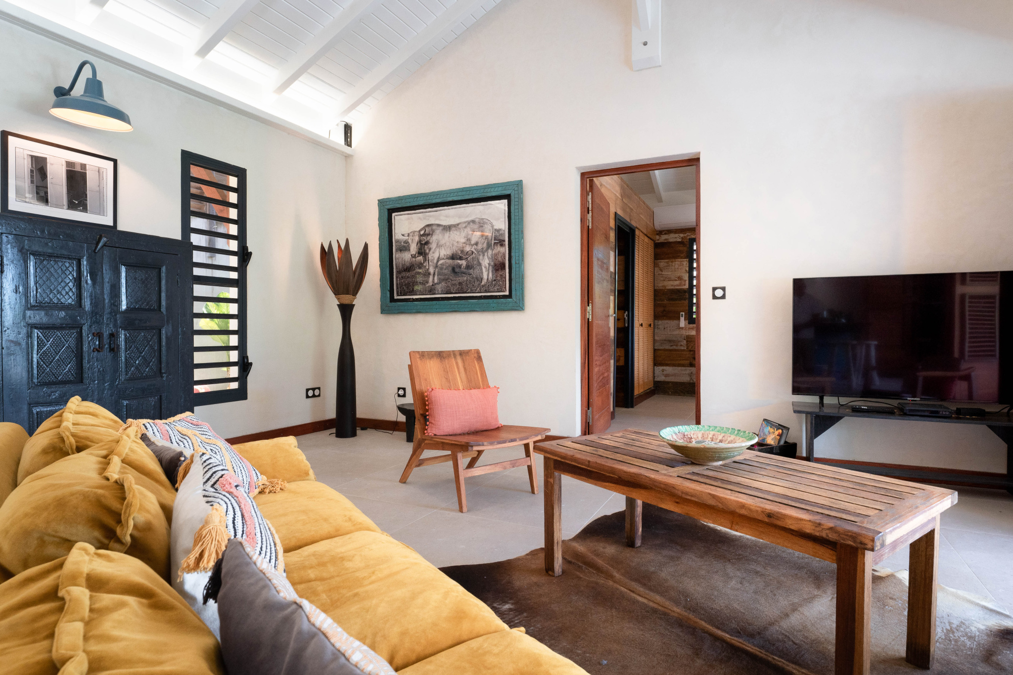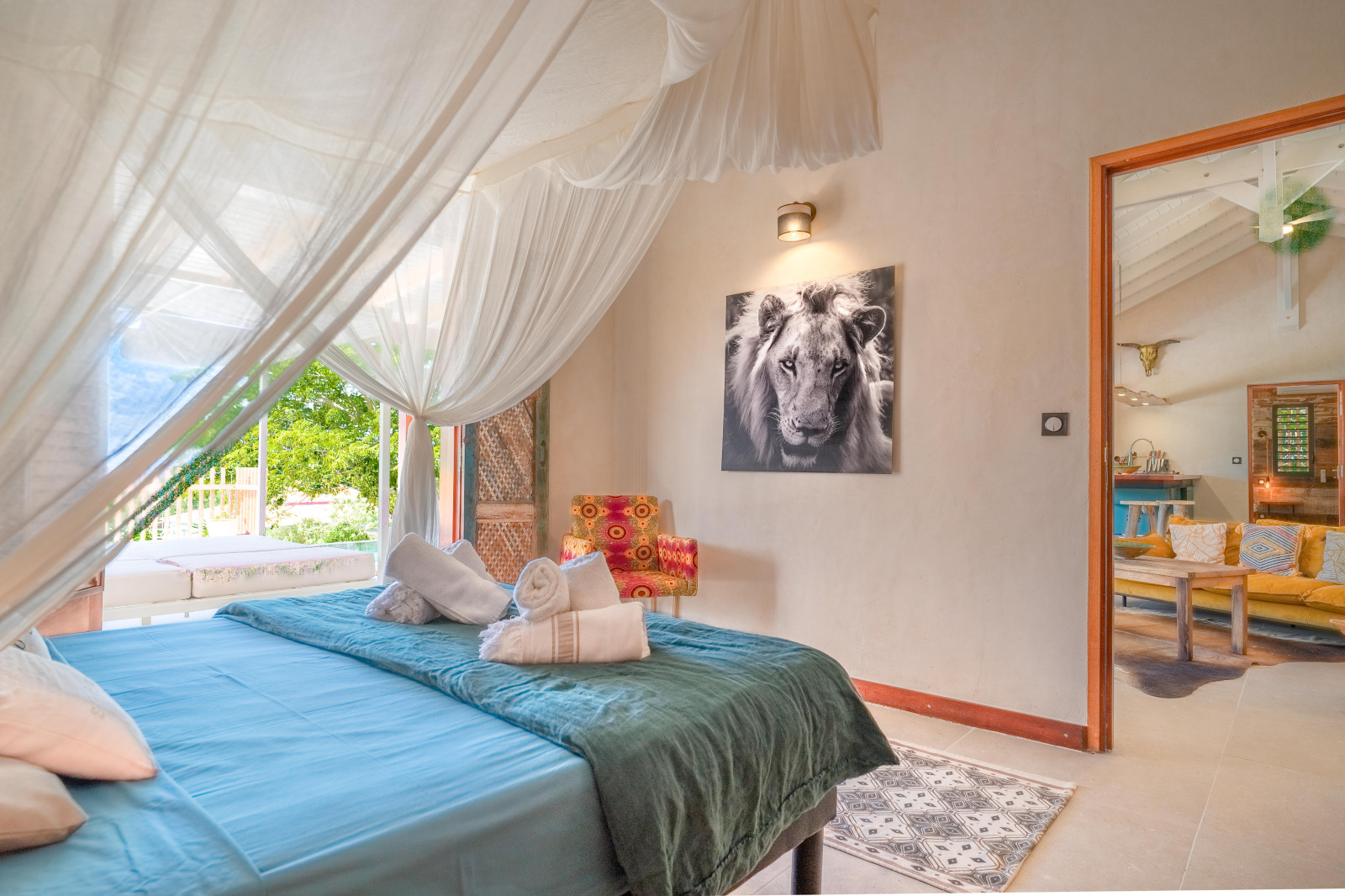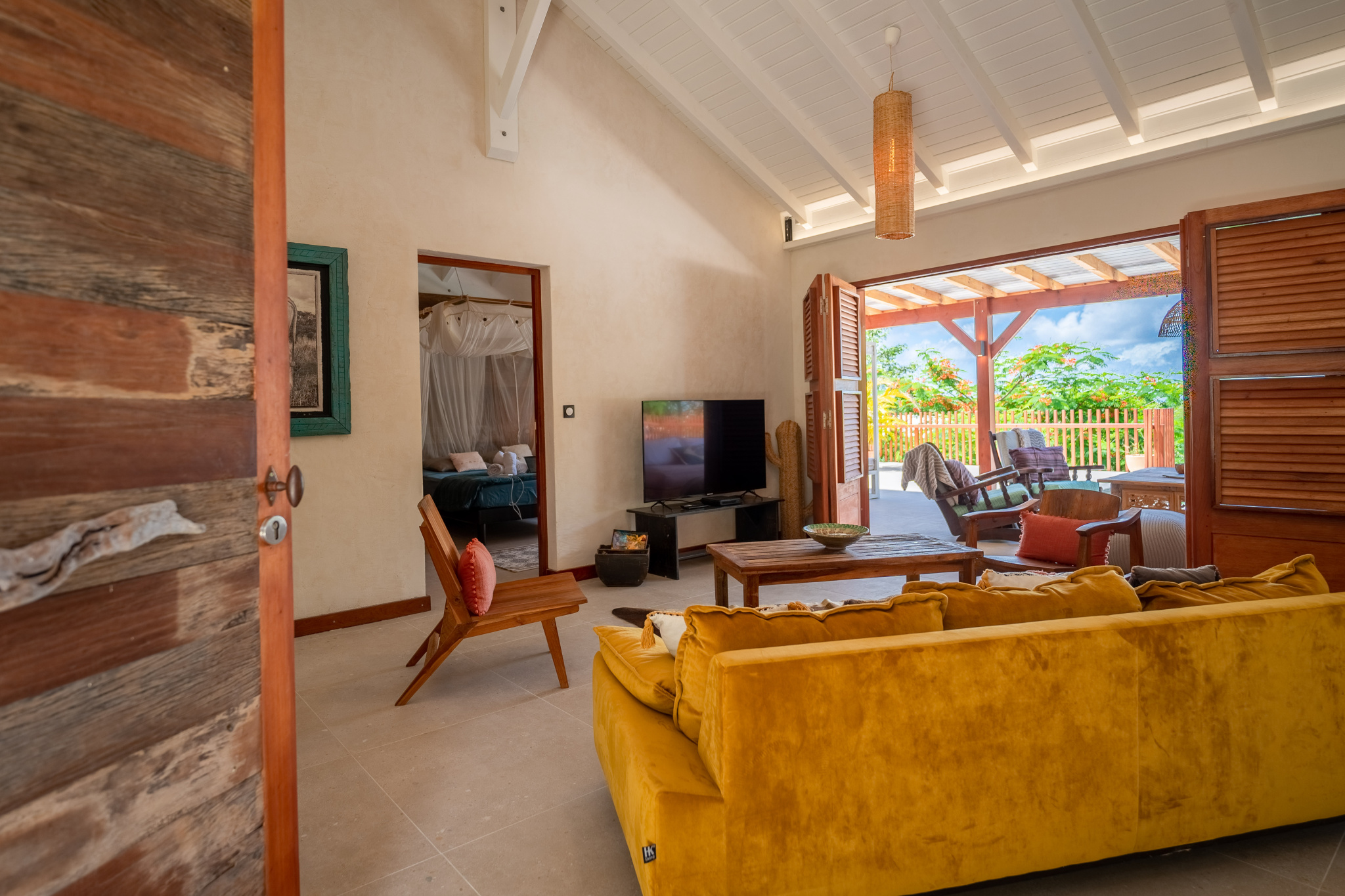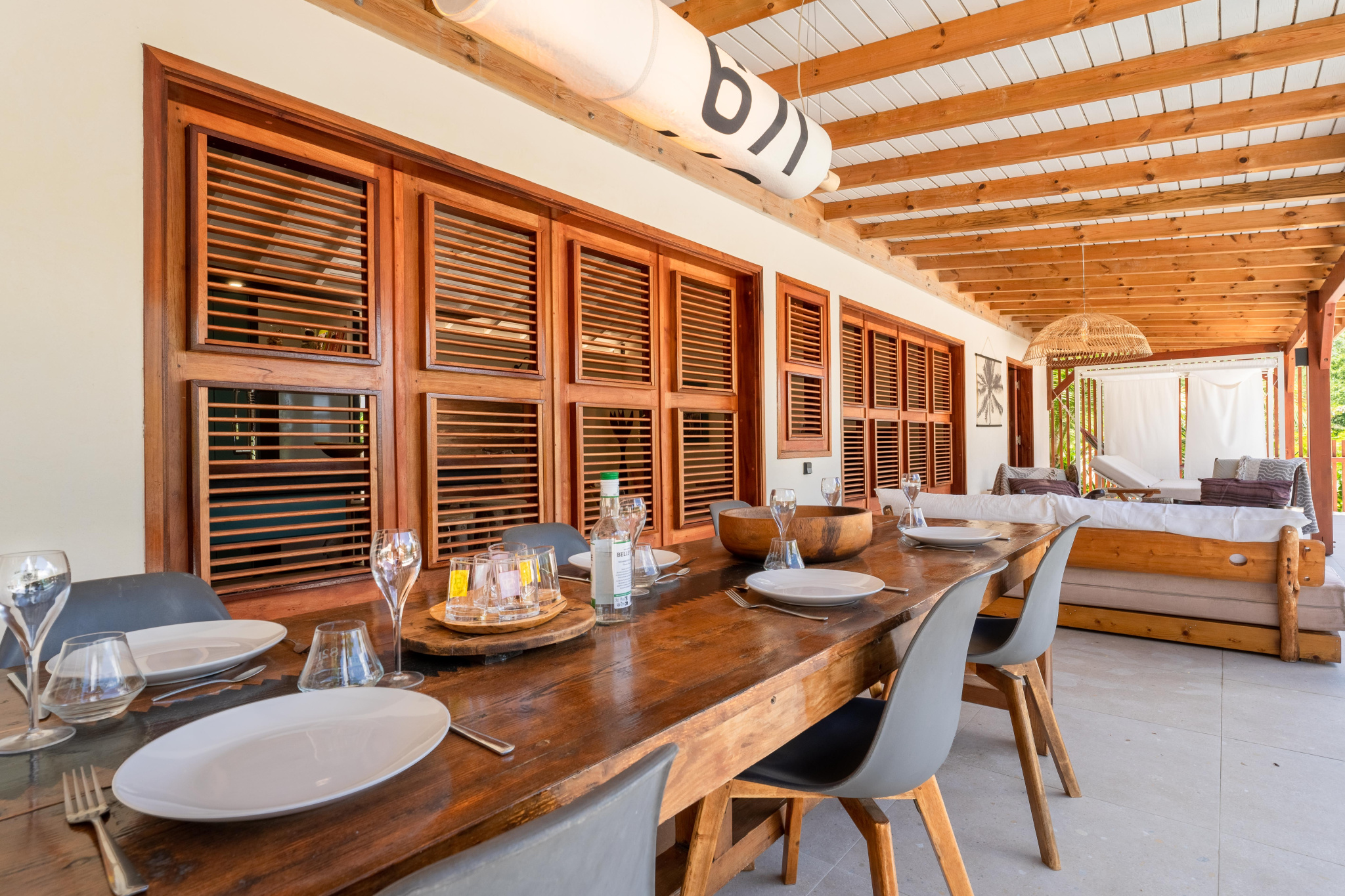 Le salon, spacieux et équipé de ventilateurs, offre un espace convivial et frais qui s'ouvre largement sur la galerie couverte la piscine, le jardin et la mer.